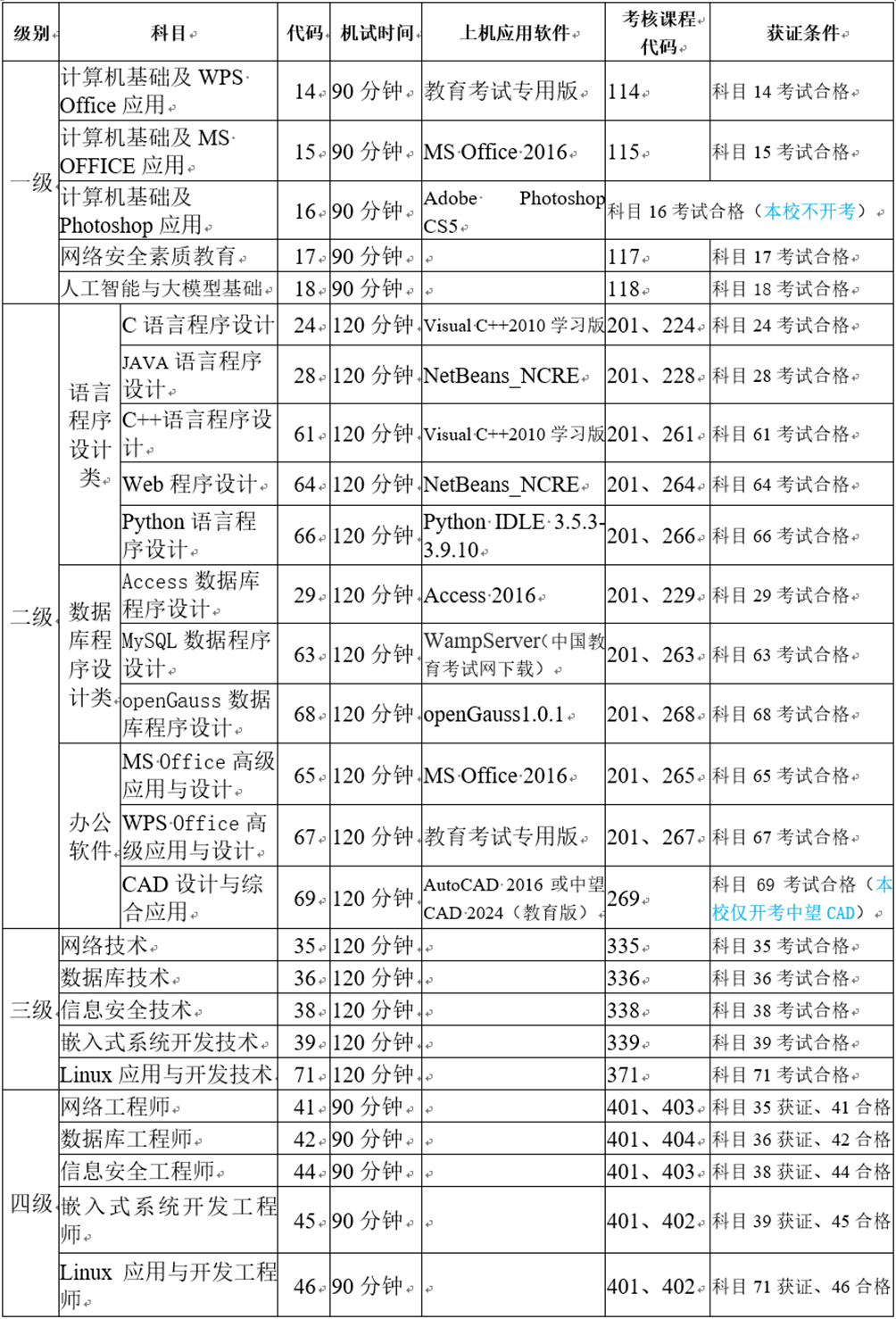 1.从2022年9月考试起,新增二级opengauss数据库程序设计(科目代码68);从2025年9月考试起,新增一级人工智能与大模型基础(科目代码18)和二级cad设计与综合应用(科目代码69)等两个新科目。一级人工智能与大模型基础科目的考试题型为选择题和填空题。二级cad设计与综合应用科目分为中望cad和autocad两个考试版本,分别使用中望cad 2024(教育版或机械教育版)和autocad 2016,考生在报考时应谨慎选择。