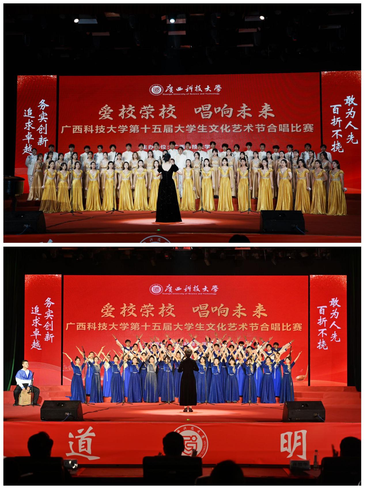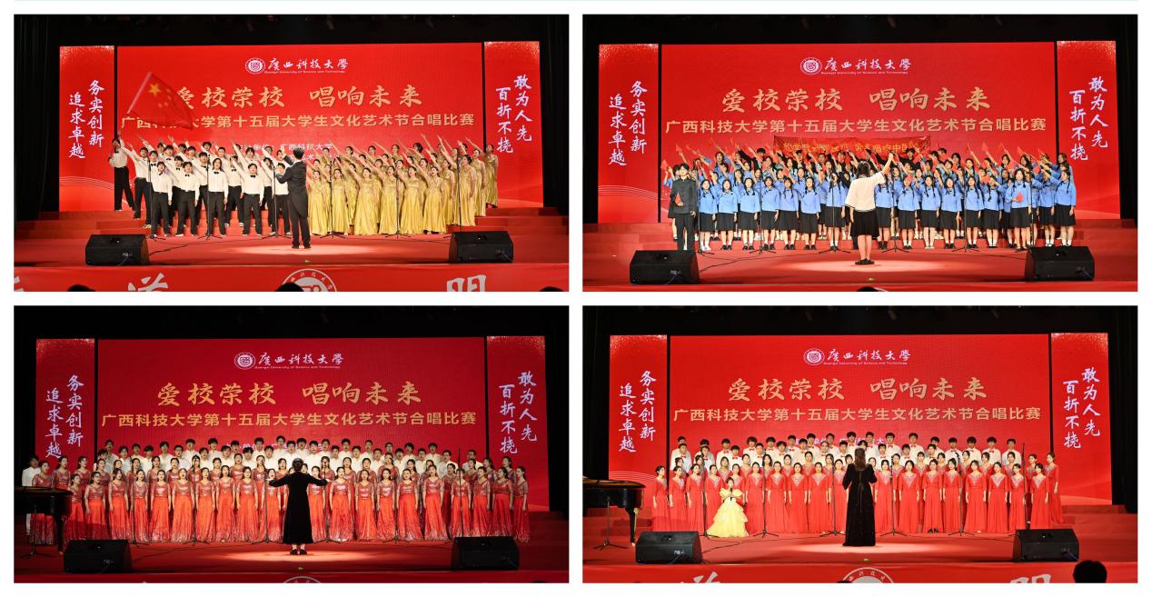12月11日晚,学校第十五届大学生文化艺术节“爱校荣校,唱响未来”合唱比赛在文昌校区大礼堂举行,本次比赛由人文艺术与设计学院承办。学校党委副书记宾月景以及相关职能部门负责人与广大师生代表一同观看了比赛。比赛由自治区音协副主席、柳州市文联副主席、柳州市音协主席李燕等5名专家教授担任评委。