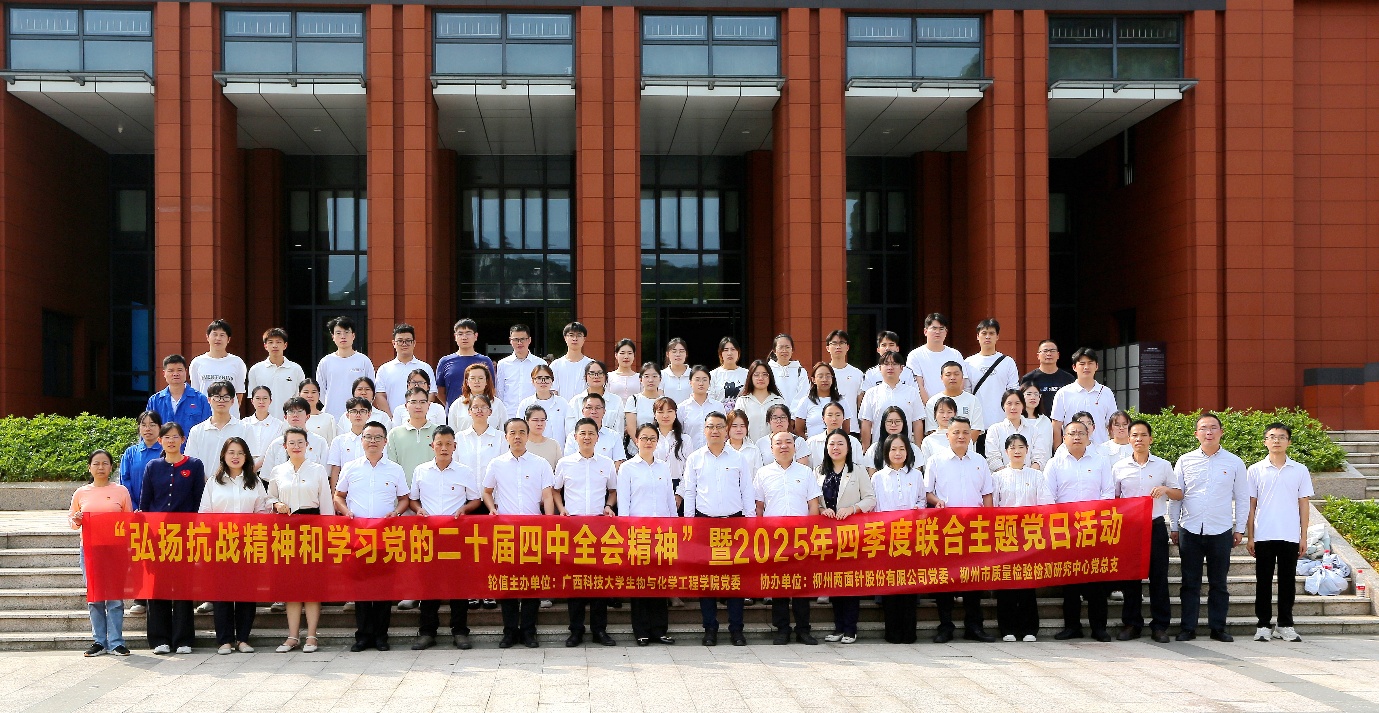 10月29日下午,广西科技大学生物与化学工程学院党委联合柳州两面针股份有限公司党委、柳州市质量检验检测研究中心党总支,组织党员赴柳州市军事博物园,开展“弘扬抗战精神和学习党的二十届四中全会精神”暨2025年第四季度联合主题党日活动。