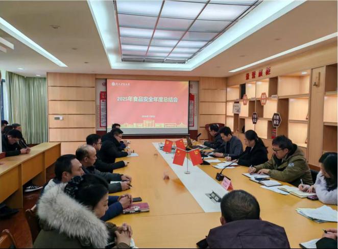 1月8日,学校在文昌校区老办公楼二楼会议室召开2025年12月食品安全月调度会暨2025校园食品安全年度总结会。后勤处处长陈文彬、副处长尹琛,饮食服务中心工作人员、各食堂负责人、定点供货商及合作经营企业负责人参会。会议全面复盘了2025年度校园食品安全工作,部署了2026年度及寒假期间重点食品安全任务。会议强调,各单位要压实食材采购、储存、加工、销售全链条责任,严守安全底线。