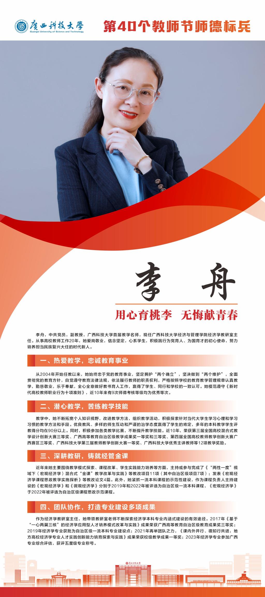 值我国第40个教师节来临之际,为全面贯彻新时代党的教育方针,落实立德树人根本任务,大力弘扬教育家精神,激励全校教职工爱岗敬业、锐意进取,不断提升教育教学和管理服务水平,营造尊师重教良好风尚,近日,学校评选并表彰了一批第40个教师节师德标兵、优秀教师、优秀教育工作者、优秀辅导员。根据《中共广西科技大学委员会关于表彰第40个教师节师德标兵、优秀教师、优秀教育工作者、优秀辅导员的决定》(科大党发〔2024〕68号)精神,决定对蔡亮等10名师德标兵、郑伟光等10名优秀教师、卢志平等10名优秀教育工作者、王俊辉等8名优秀辅导员进行表彰。