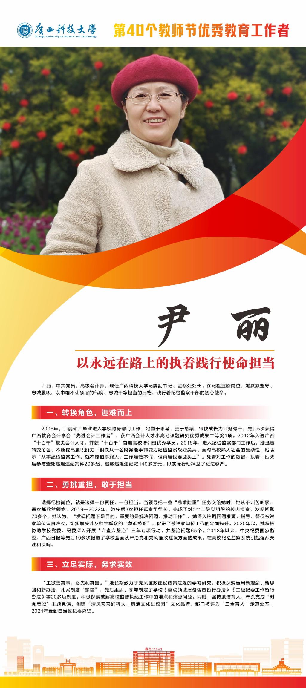 接下来,我们将推出系列报道,为大家介绍我校这些优秀教师。今天就让我们一起走近学校“优秀教育工作者”尹丽吧。
