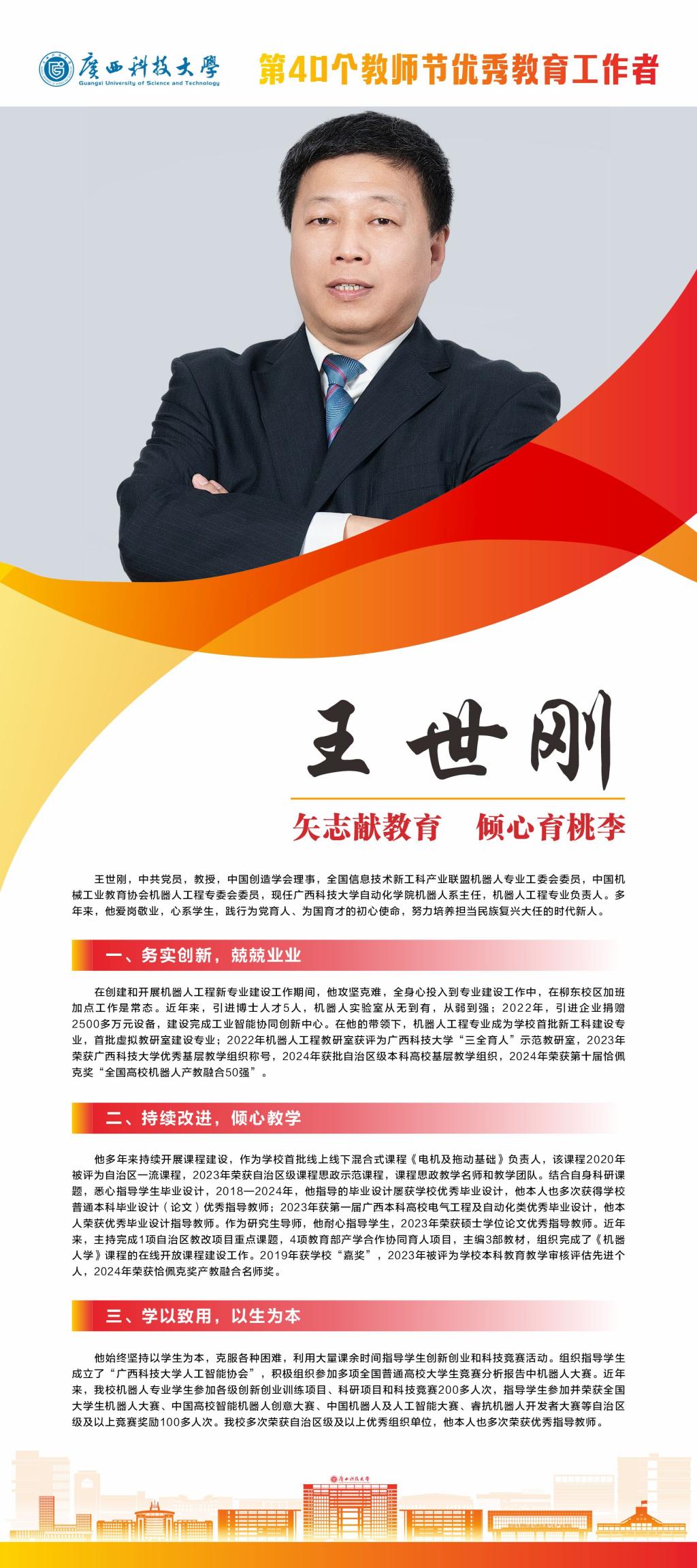 值我国第40个教师节来临之际,为全面贯彻新时代党的教育方针,落实立德树人根本任务,大力弘扬教育家精神,激励全校教职工爱岗敬业、锐意进取,不断提升教育教学和管理服务水平,营造尊师重教良好风尚,近日,学校评选并表彰了一批第40个教师节师德标兵、优秀教师、优秀教育工作者、优秀辅导员。根据《中共广西科技大学委员会关于表彰第40个教师节师德标兵、优秀教师、优秀教育工作者、优秀辅导员的决定》(科大党发〔2024〕68号)精神,决定对蔡亮等10名师德标兵、郑伟光等10名优秀教师、卢志平等10名优秀教育工作者、王俊辉等8名优秀辅导员进行表彰。
