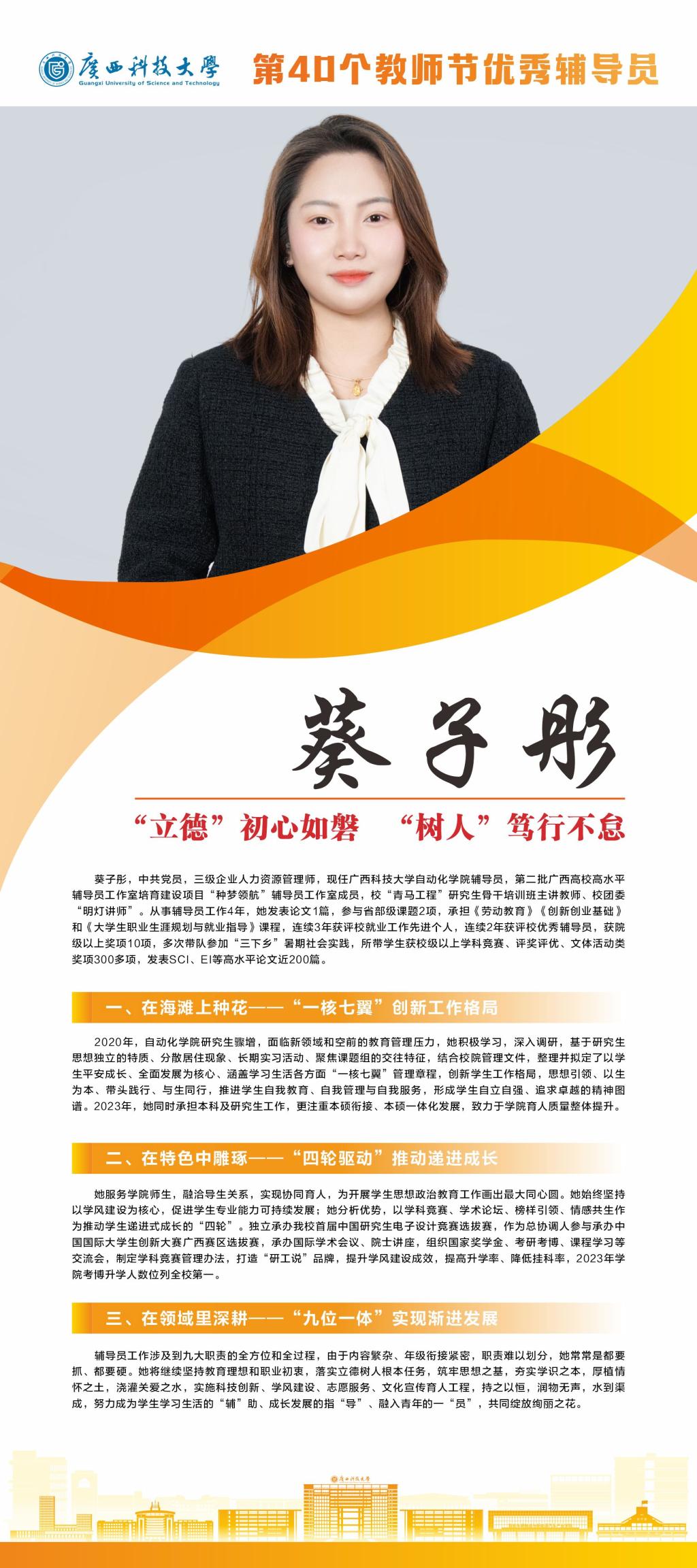 值我国第40个教师节来临之际,为全面贯彻新时代党的教育方针,落实立德树人根本任务,大力弘扬教育家精神,激励全校教职工爱岗敬业、锐意进取,不断提升教育教学和管理服务水平,营造尊师重教良好风尚,近日,学校评选并表彰了一批第40个教师节师德标兵、优秀教师、优秀教育工作者、优秀辅导员。根据《中共广西科技大学委员会关于表彰第40个教师节师德标兵、优秀教师、优秀教育工作者、优秀辅导员的决定》(科大党发〔2024〕68号)精神,决定对蔡亮等10名师德标兵、郑伟光等10名优秀教师、卢志平等10名优秀教育工作者、王俊辉等8名优秀辅导员进行表彰。