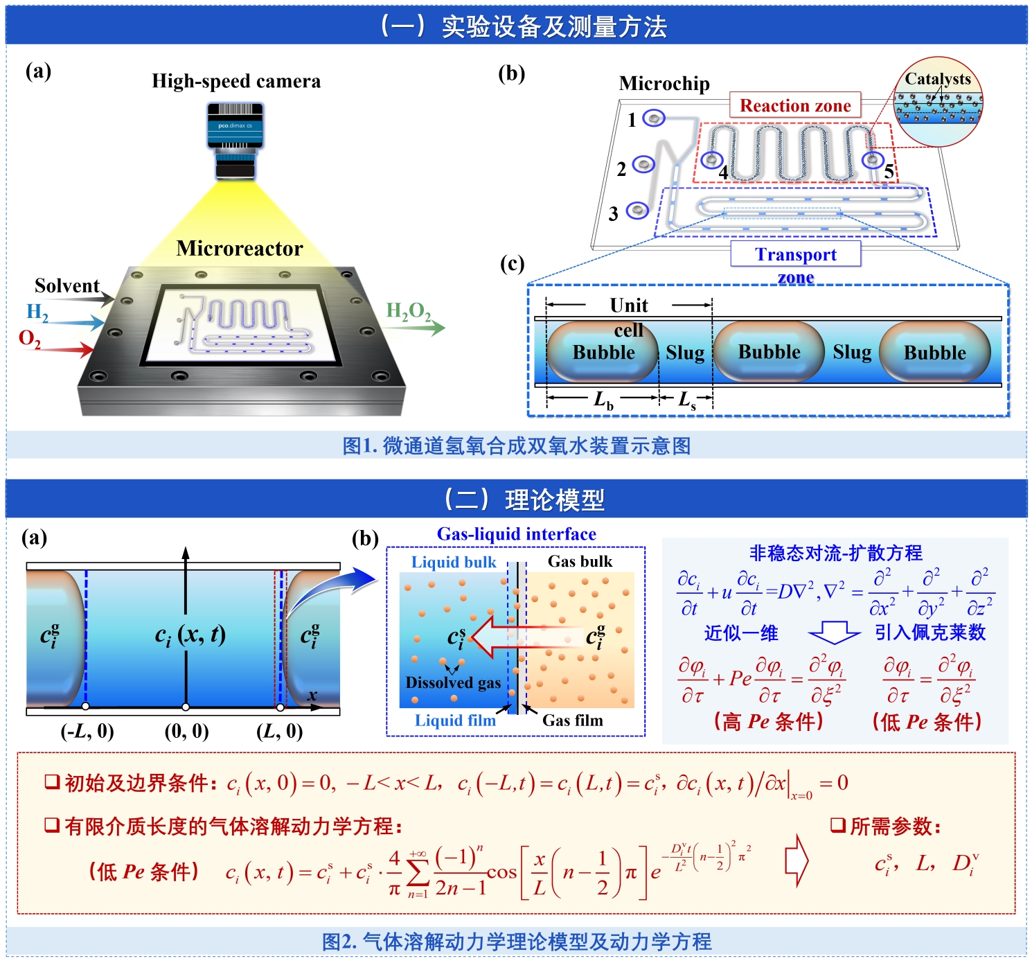 在多相催化反应中,化学反应一般都是用宏观热力学(如压强、温度、浓度)等进行调控,而用动力学调控却比较少。动力学调控在微反应器中影响非常深远,但相关理论研究非常匮乏。本工作以微通道内氢气和氧气直接合成双氧水为例,研究了气体溶解动力学(gdd)这一非平衡态过程对反应的影响机制。通过结合高速成像技术与一维非稳态对流-扩散理论模型,引入佩克莱数(pe)定量表征微通道内气体溶解动力学行为,系统探究了液塞长度、溶剂类型及流速等参数对gdd过程的影响,建立了适用于低pe条件下gdd经验模型。该模型可直接预测不同操作参数下 h2与o2的饱和时间,为微反应器气液传质参数的精准设计提供定量依据。该研究不仅深化了对微通道内多相传质过程的理解,也为微通道多相反应的设计与优化提供了系统的理论和实验支撑。