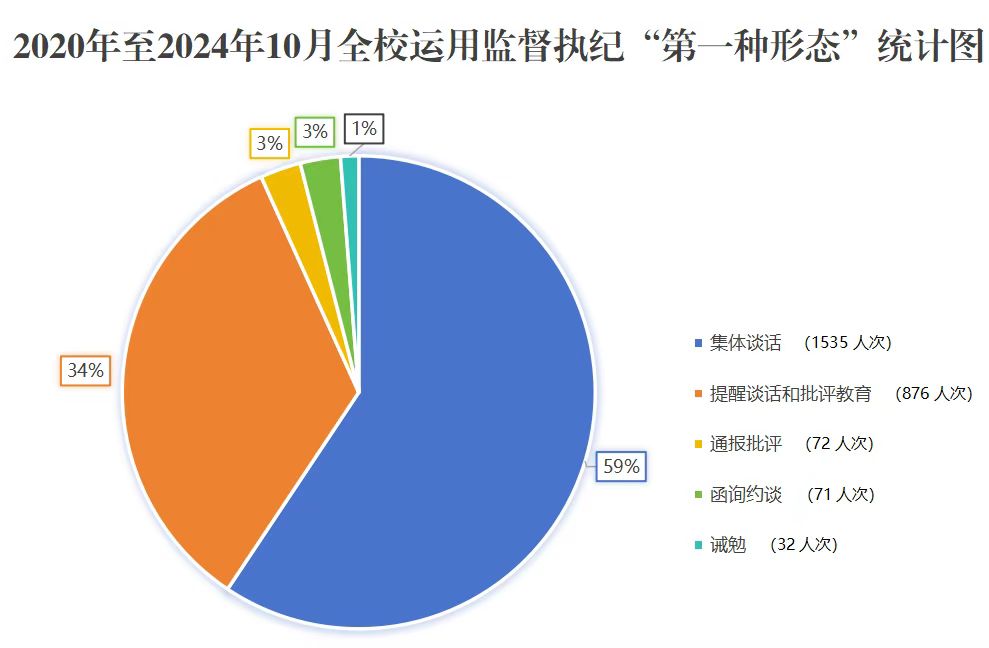 “第一种形态”深化运用。树牢严管厚爱理念,坚持抓早抓小,防微杜渐。5年来,全校运用“第一种形态”2586人次,其中提醒谈话和批评教育876人次,集体谈话1535人次,函询约谈71人次,通报批评72人次,诫勉32人次。