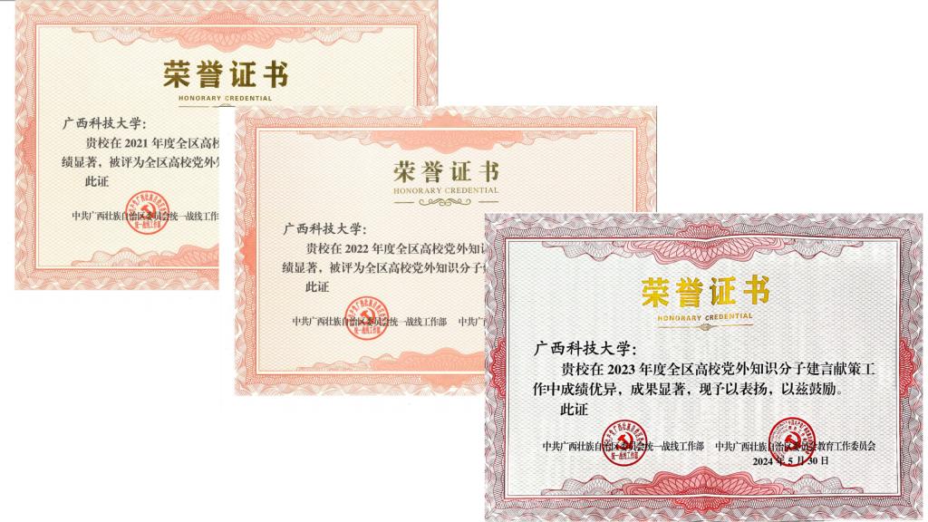 牵线搭桥支持建言献策。建章立制,引导党外知识分子立足岗位建功立业,参与社会服务。建成“广西留学人员建言献策基地”“柳州市留学人员建言献策基地”和“民进广西区委会咨政建言合作平台”3个建言献策平台,入选各级党委、政府统战智库专家50多名。以建言献策信息征集活动为牵引,完善组织保障体系,团结各方力量,贡献统战智慧。五年来,建言献策成果被各级党委和政府和有关部门采纳累计70篇,学校连续3年获评广西高校建言献策先进集体。